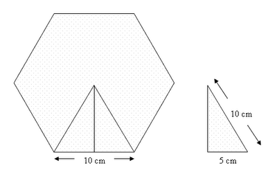 Vamos a ver un caso especial, el del hexágono. Resulta que en el hexágono el radio y el lado tienen la misma longitud, ya que los triángulos en que se descompone el hexágono no son isósceles, si no equiláteros. Esto es fácil de ver si tenemos en cuenta que si dividimos 360º entre 6 nos da 60º, dado que los otros dos ángulos sabemos que tienen que ser iguales, vemos que los 3 valen 60º (para que sumen 180º) por lo que el triángulo es equilátero. Sabiendo ésto, al resolver un problema no será necesario que nos den el valor del radio y del lado, solo nos darán uno de ellos. Además, a partir de éste, la apotema quedará fijada por el teorema de Pitágoras. Por ejemplo, halla el área de un hexágono de lado 10 cm.